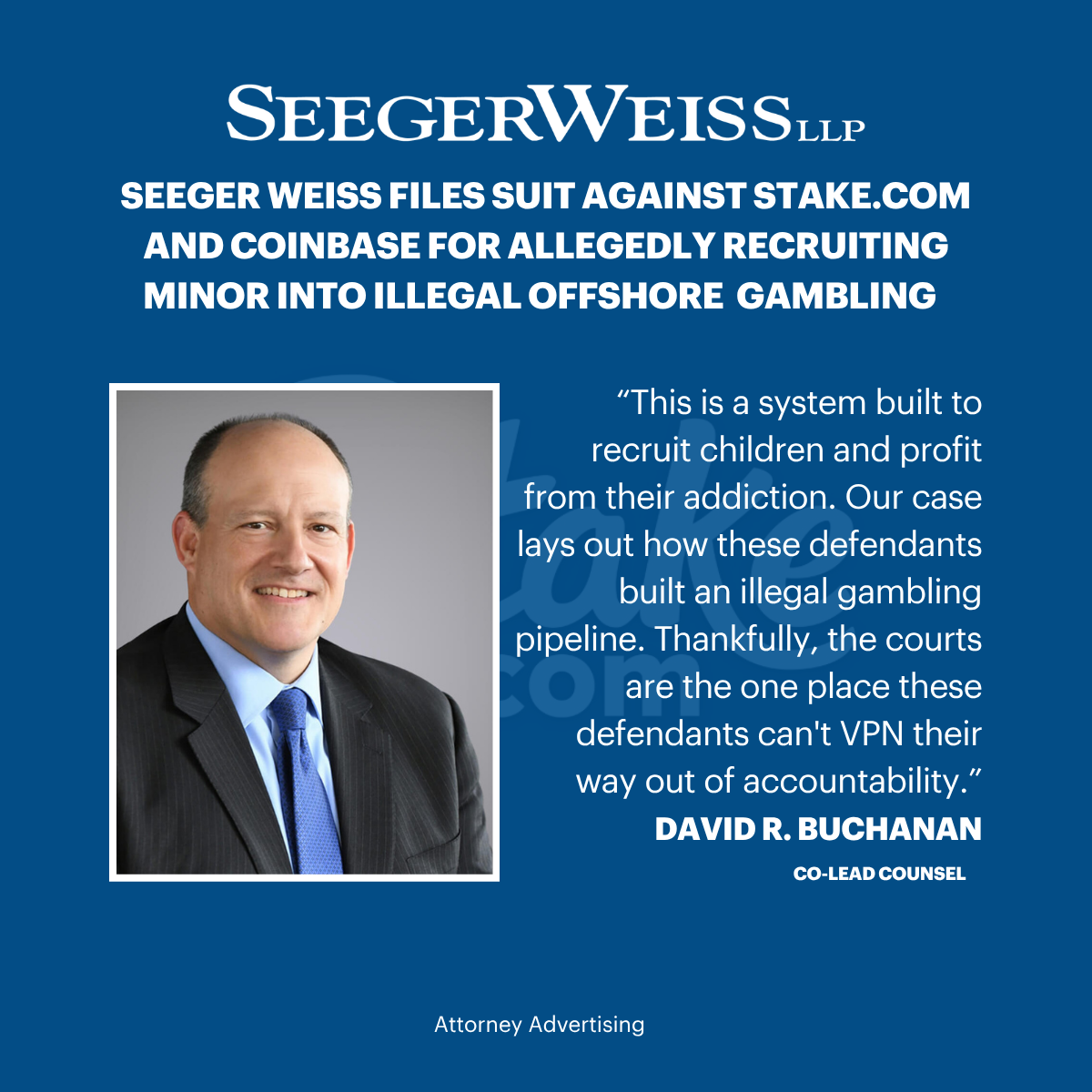 Seeger Weiss has filed a lawsuit in New York Supreme Court against Stake.com, an offshore online gambling platform, and Coinbase, alleging that the defendants recruited and enabled a then-12-year-old minor into illegal crypto gambling, causing severe and lasting harm.